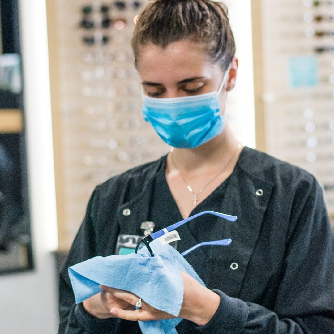 Yes! All frames after every touch or try-on are thoroughly cleaned with a peroxide-based solution prior to being returned to the frame board. As such, patients will be accompanied by a staff member during the entire frame selection process​ to ensure each frame is being cleaned.